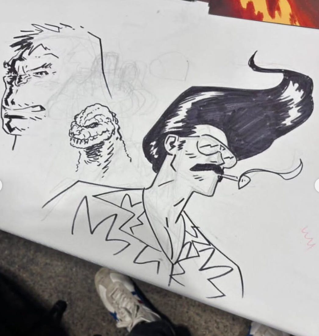 As I mentioned in my last update, I attended the Toronto Comic Con last month and was fortunate enough to sit next to my old friend Adam Gorham. Adam was good enough to do a quick sketch of Miquel Senecoza from the Florida Hippopotamus Cocaine Massacre on the covering of his table, which I cut out and ended up colouring when I got home as a quick impromptu collaboration between the two of us.